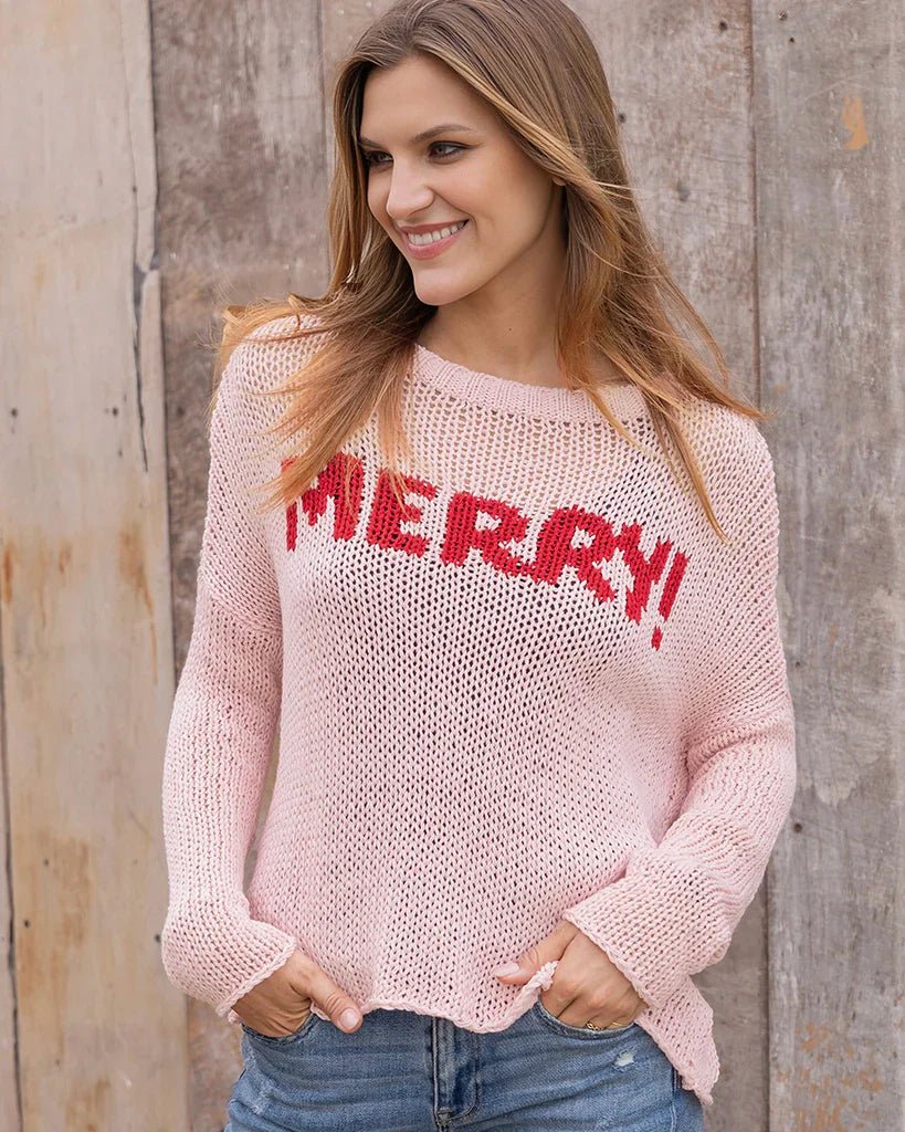 Pink cotton crewneck sweater from Wooden Ship’s with Merry! Sewn in red